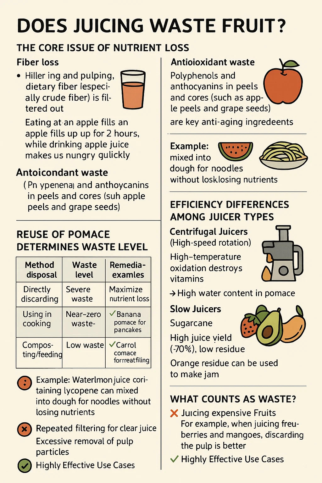 착즙 및 과육화 과정에서 식이섬유(특히 소화를 돕는 조섬유)가 걸러지는데, 이는 과일 핵심 영양소의 30~50%가 손실되는 것과 같습니다.