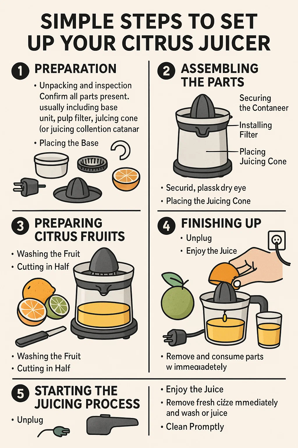 철저한 청소: 처음 사용하기 전에 모터가 있는 베이스 장치를 제외하고 과일과 접촉하는 모든 부품(주스 콘, 필터, 용기 등)을 따뜻한 비눗물로 철저히 씻은 후 완전히 헹구고 자연 건조하거나 닦아서 말려야 합니다. 이는 위생을 위한 것입니다.